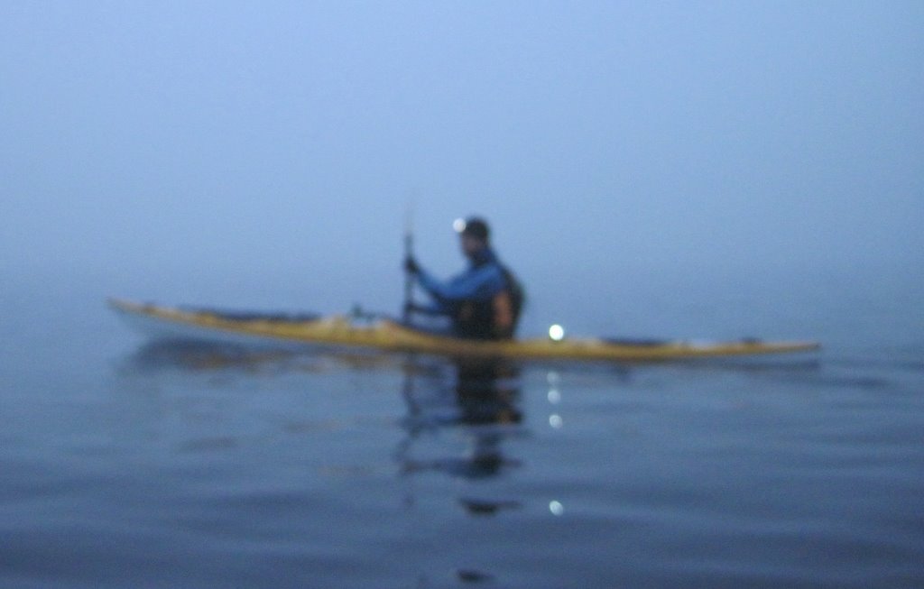 Rödlöga Storskär 02.28 på morgonen midsommaraftonTre paddlingar utmärkte sig 2003, midsommarturen till Ut Fredel var den första. Det började bra med nattpaddling från Kapellskär via Vidinge ner till Rödlöga Storskär. Efter ett par timmars sömn hann vi packa ner tält och utrustning torrt innan regn och blåsten började. En hel dag i motvind och kraftigt regn skrämde nog en del deltagare. ”Om jag välter så dör jag, och de kommer nog att begrava mig på en ö härute” var det en deltagare som sade. Kanske inte den känsla vi vill förmedla med främjandets turer ;-)